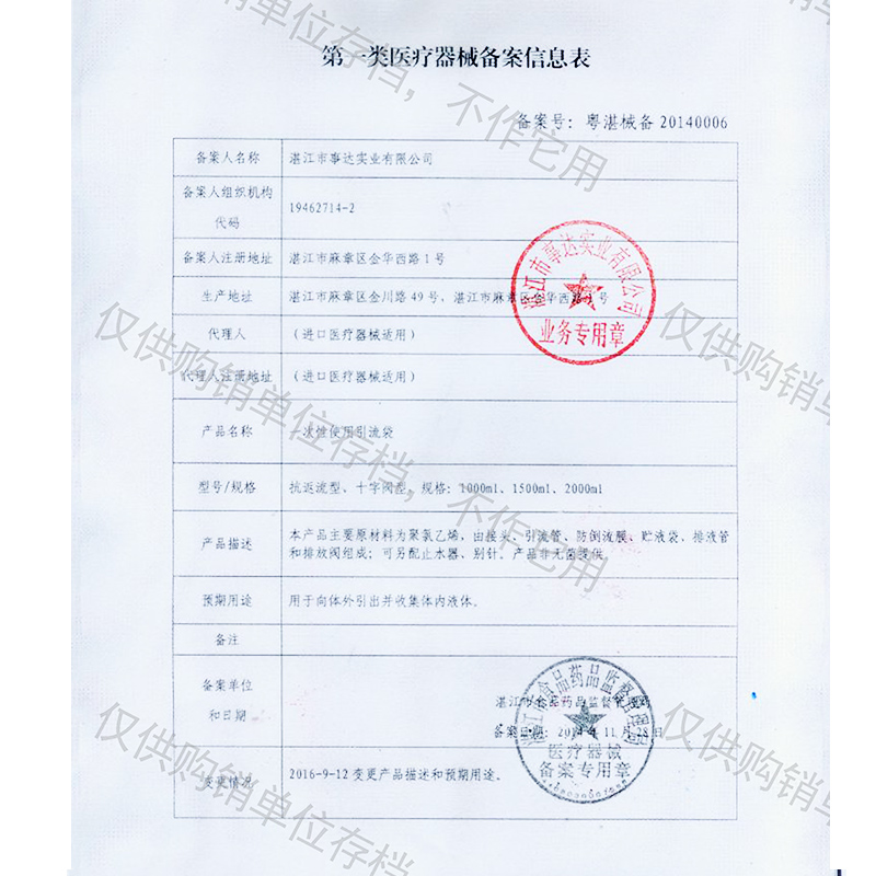 事達一次性使用引流袋用于向體外引出并收集體內(nèi)液體。使用方法:1.使用前確定排液閥塞緊。2.將進液管的保護帽取下后,將進尿管與導(dǎo)尿管的接頭連接,即可使用。3.當袋體充盈后,可將排液閥的護塞略微拔出,便可放液;放液后繼續(xù)使用時,需將活塞復(fù)位推緊,以免漏液。