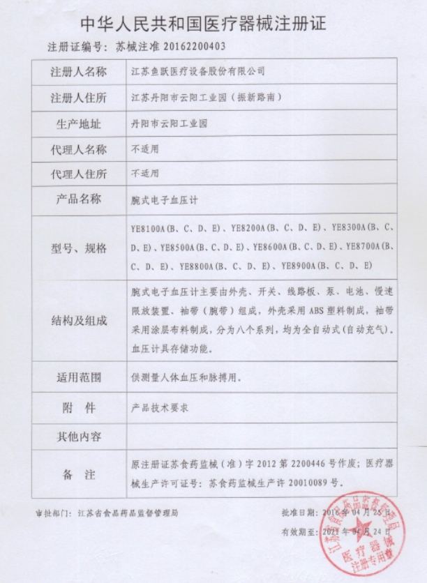 魚躍腕式電子血壓計技術參數:顯示方式:LCD數字顯示;測量方法:示波法;測量范圍:壓力:0~280mmHg(0~37.3 KPa);脈搏數:40~200次/分;精度:壓力:±4mmHg(±0.5 KPa)以內,脈搏數:讀出數值的±5%以內,設備運行方式:間歇式運行方式,電氣安全分類:BF型,加壓方式:充氣泵自動加壓,減壓方式:慢速泄氣閥自動減壓,排氣方式:電磁閥自動快速排氣,壓力檢測方式:電阻式壓力傳感器,記憶數組:60組測量數據,電源:2節(jié)7號干電池。