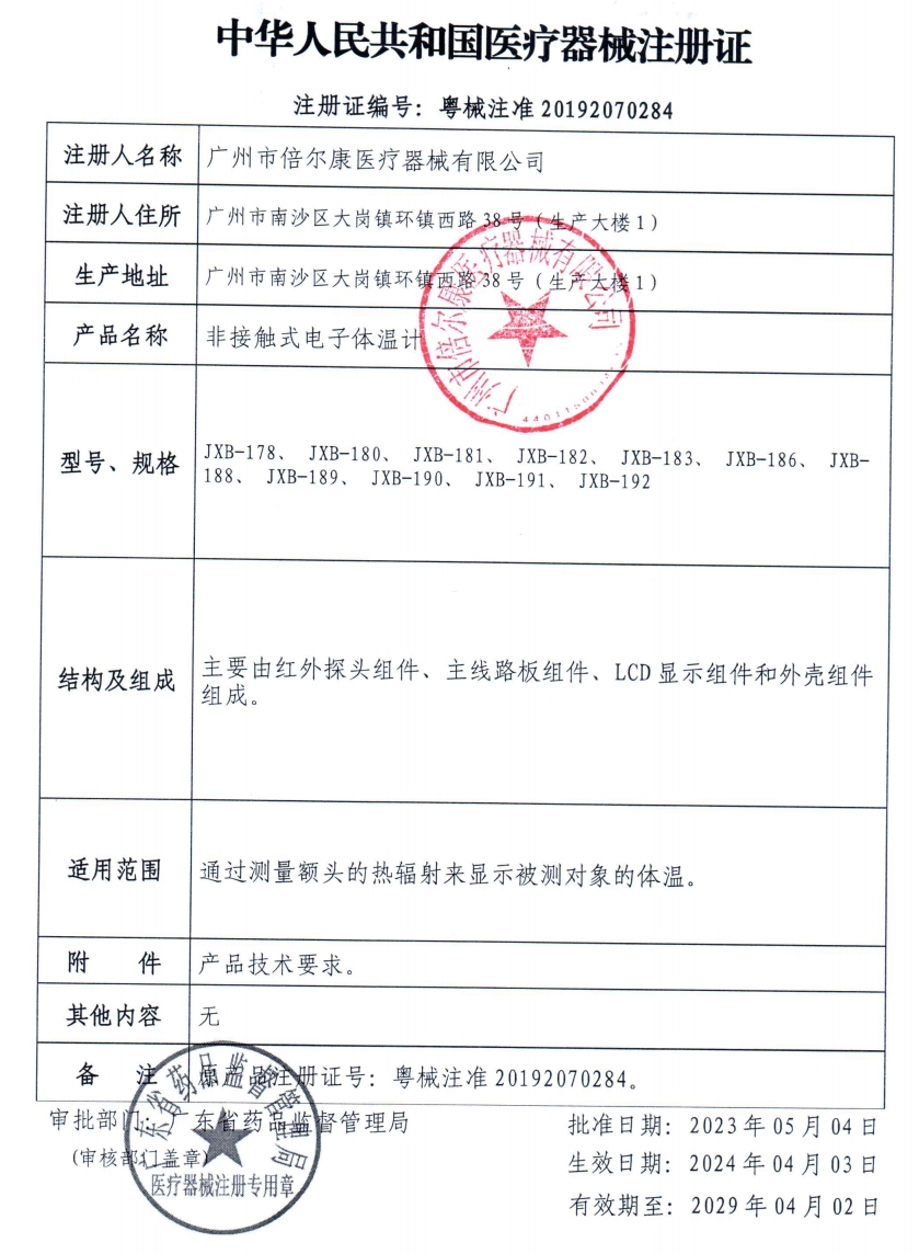 非接觸式電子體溫計(jì)(倍爾康)產(chǎn)品性能:快速:測量時(shí)間1秒鐘;易用:一鍵測量,操作簡便;使用次數(shù):按鍵10萬次。非接觸:對(duì)額頭測量,不接觸人體皮膚,避免交叉感染。測量距離:3cm~5cm。其適用范圍是通過測量額頭的熱輻射來顯示被測對(duì)象的體溫。