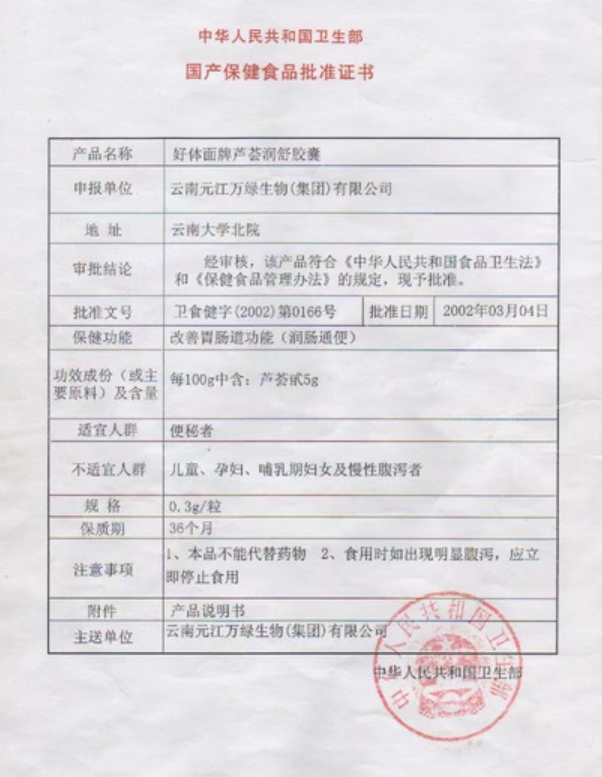 好體面牌蘆薈潤舒膠囊保健功能:改善胃腸道功能(潤腸通便);適宜人群:便秘者;不適宜人群:兒童、孕婦、哺乳期婦女及慢性腹瀉者。