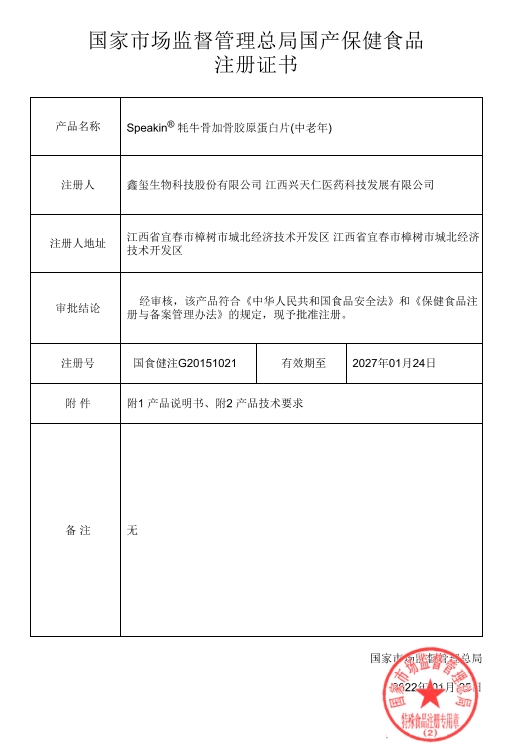 鑫璽Speakin牦牛骨加骨膠原蛋白片(中老年)保健功能:經(jīng)動物實驗評價,具有增加骨密度的保健功能;適宜人群:中老年人;不適宜人群:少年兒童、孕婦、乳母。