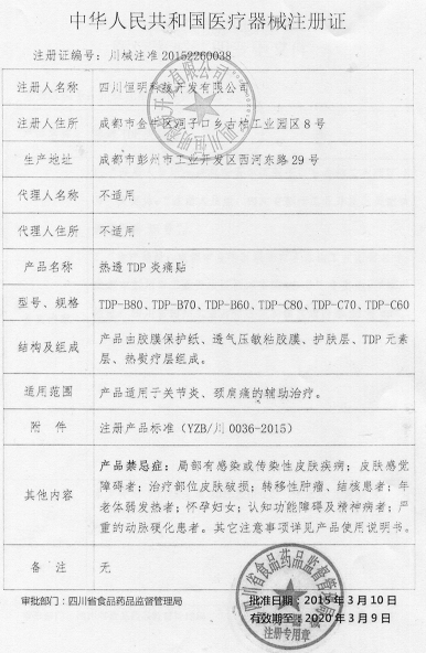 恒明醫(yī)療熱透TDP炎痛貼由膠膜保護(hù)紙、透氣壓敏粘膠膜、護(hù)膚層、TDP元素層、熱熨療層組成。適用于關(guān)節(jié)炎、頸肩痛的輔助治療。一日每一患部1貼,或遵醫(yī)囑。皮膚感覺(jué)障礙者、懷孕婦女、轉(zhuǎn)移性腫瘤、結(jié)核患者禁用本產(chǎn)品。