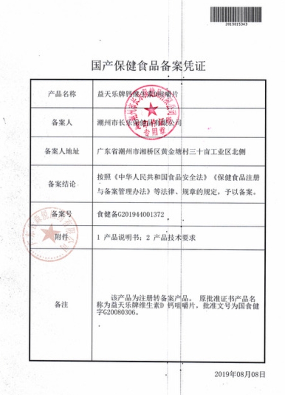 益天樂牌鈣維生素D咀嚼片(葵花益佰)保健功能:補充鈣、維生素D;適宜人群:需要補充鈣、維生素D的4-10歲人群及成人;不適宜人群:3歲以下人群及孕婦。每日1次,每次1片,嚼食。本品不能代替藥物。適宜人群外的人群不推薦食用。