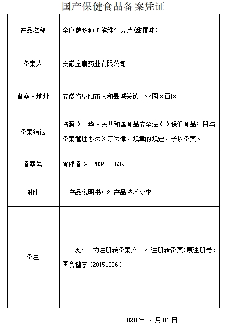 全康牌多種B族維生素片(甜橙味)保健功能:補(bǔ)充多種B族維生素;適宜人群:需要補(bǔ)充多種B族維生素的成人;不適宜人群:17歲以下人群及孕婦、乳母。每日2次,每次1片,食用方法:吞食或含食。