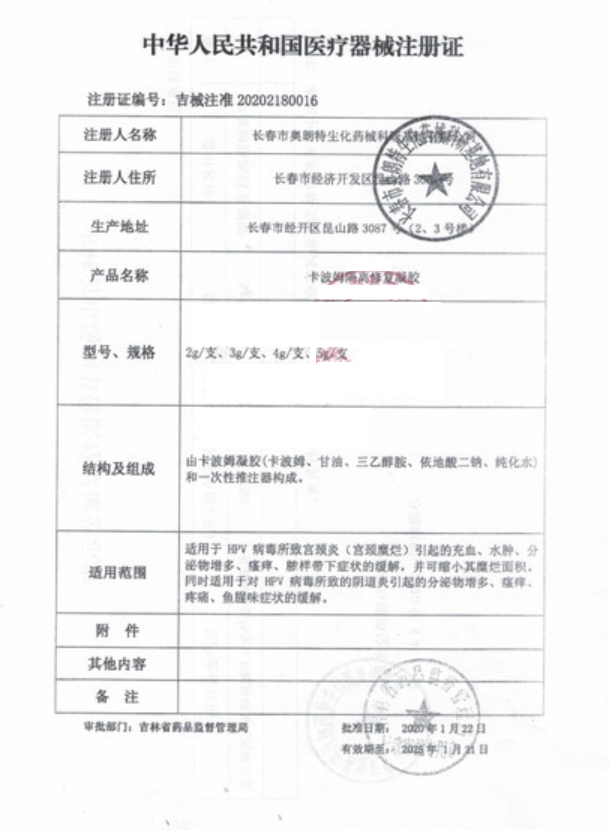 卡波姆隔離修復凝膠(奧賽羅HPV/潤伊康)適用于HPV病毒所致宮頸炎(宮頸糜爛)引起的充血、水腫、分泌物增多、瘙癢、膿樣帶下癥狀的緩解,并可縮小其糜爛面積。經(jīng)期停用。孕婦、處女、過敏者禁用。