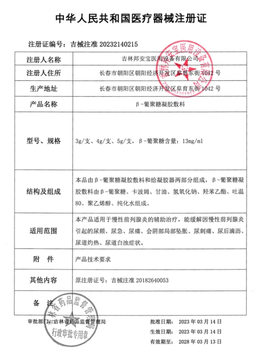 Β-葡聚糖凝膠敷料(七維健康/列必舒)適用于慢性前列腺炎的輔助治療,能緩解因慢性前列腺炎引起的尿頻、尿急、尿痛、會陰部局部墜脹、尿刺痛、尿后滴瀝、尿道灼熱、尿道白濁癥狀。
