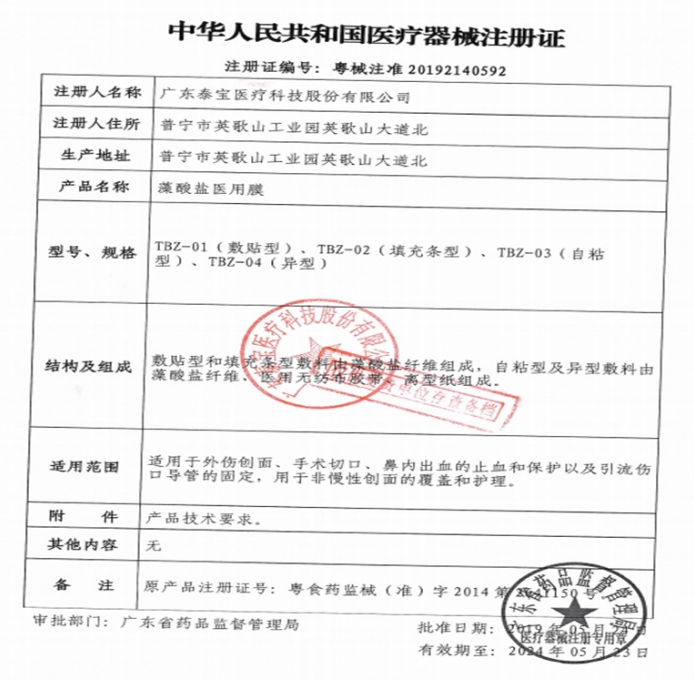 藻酸鹽醫(yī)用膜(泰寶/ALGINATE)適用于外傷創(chuàng)面、手術(shù)切口、鼻內(nèi)出血的止血和保護以及引流傷口導(dǎo)管的固定,用于非慢性創(chuàng)面的覆蓋和護理。