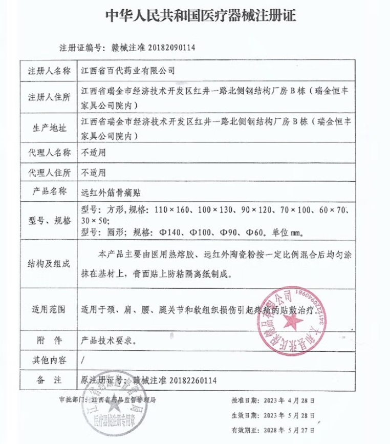 楊工坊苗方百草止痛貼遠紅外筋骨痛貼主要由醫(yī)用熱熔膠、遠紅外陶瓷粉按一定比例混合后均勻涂抹在基材上,膏面貼上防粘隔離紙制成。適用于頸、肩、腰、腿關(guān)節(jié)和軟組織損傷引起疼痛的貼敷治療。