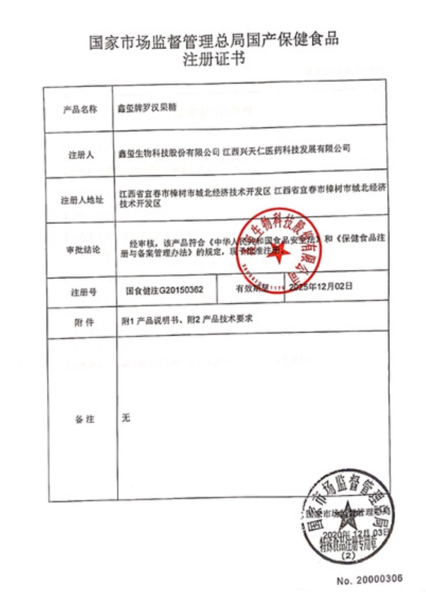 葵花之鑫鑫璽牌羅漢果糖原料:羅漢果提取物;輔料:白砂糖、葡萄糖漿、蜂蜜、薄荷油、薄荷腦。每100g含:總黃酮75mg。保健功能:清咽;適宜人群:咽部不適者;不適宜人群:嬰幼兒、孕婦、乳母。每日5次,每次1片,含服。