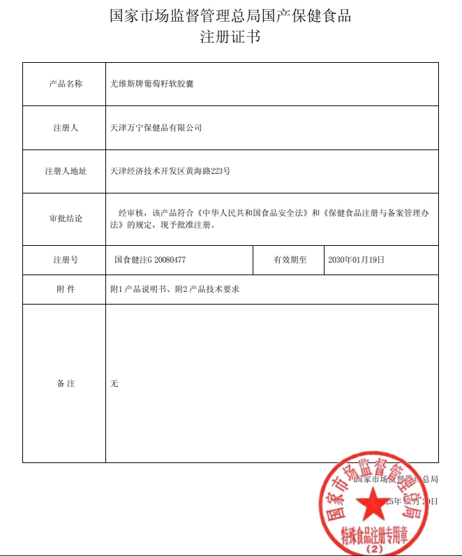 維多萊尤維斯牌葡萄籽軟膠囊保健功能:抗氧化;適宜人群:中老年人;不適宜人群:少年兒童、孕婦、乳母。每日2次,每次2粒,溫水吞食。本品不能代替藥物。適宜人群外的人群不推薦食用本產(chǎn)品。