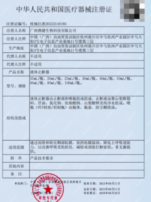 澀岡液體止鼾器由止鼾液和噴瓶組成,止鼾液由聚山梨醇脂80、甘油、氯化鈉、依地酸鈉、山梨酸鉀及純凈水組成。噴瓶(PET材質(zhì)/鋁制瓶)由瓶體,瓶蓋,防塵帽組成。通過潤滑和軟化咽部粘膜,保持粘膜濕潤,降低上呼吸道阻力,以改善呼吸受阻狀況,減輕或消除打鼾癥狀。非無菌提供。