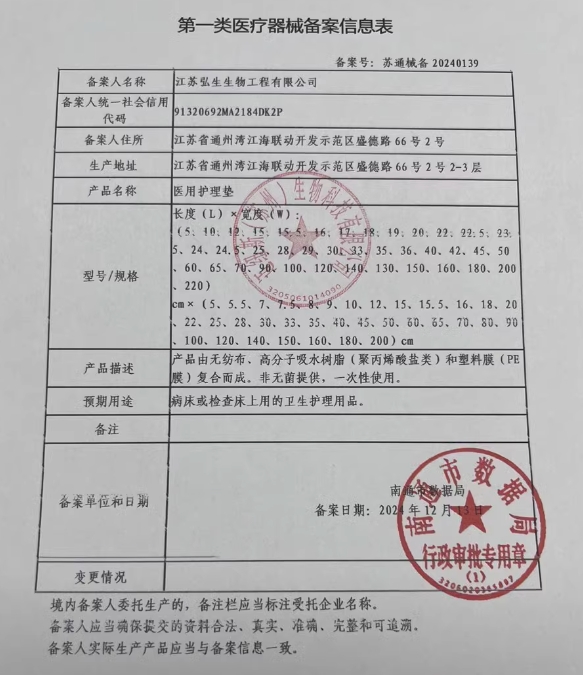 弘生醫(yī)用護理墊由無紡布、高分子吸水樹脂(聚丙烯酸鹽類)和塑料膜(PE膜)復合而成。非無菌提供,一次性使用。本品為病床或檢查床上用的衛(wèi)生護理用品。使用前請檢查包裝是否完好,并對外包裝標志、生產日期、有效期進行確認,并在有效期內使用。