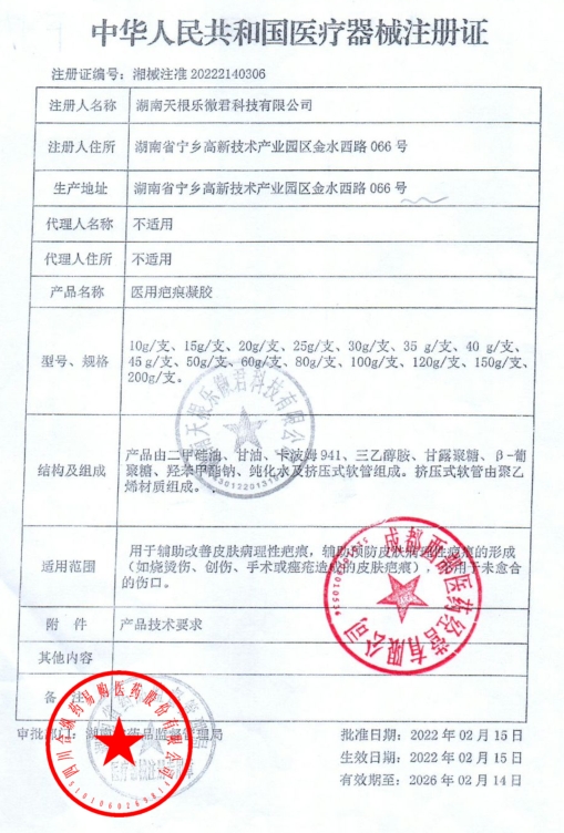 修正醫(yī)用疤痕凝膠用于輔助改善皮膚病理性疤痕,輔助預(yù)防皮膚病理性疤痕的形成(如燒燙傷、創(chuàng)傷、手術(shù)或痤瘡造成的皮膚疤痕),不用于未愈合的傷口。使用本品前確保疤痕部位清潔干燥,取本品適量涂抹在患處,輕輕按摩,每日使用2~4次或道醫(yī)囑。