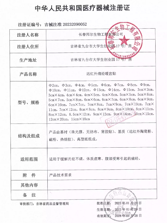 同普堂遠(yuǎn)紅外痛經(jīng)暖宮貼由基襯(珠光膜、無(wú)紡布、背膠貼)、基質(zhì)(遠(yuǎn)紅外陶瓷粉、磁片、熱熔膠)、離型紙組成。適用于緩解月經(jīng)不調(diào)、體質(zhì)虛寒、腹部受寒引起的痛經(jīng)。對(duì)本品過(guò)敏者禁用。出血及有出血傾向者禁用。使用部位有感染、開(kāi)放性傷口、皮膚病者禁用。