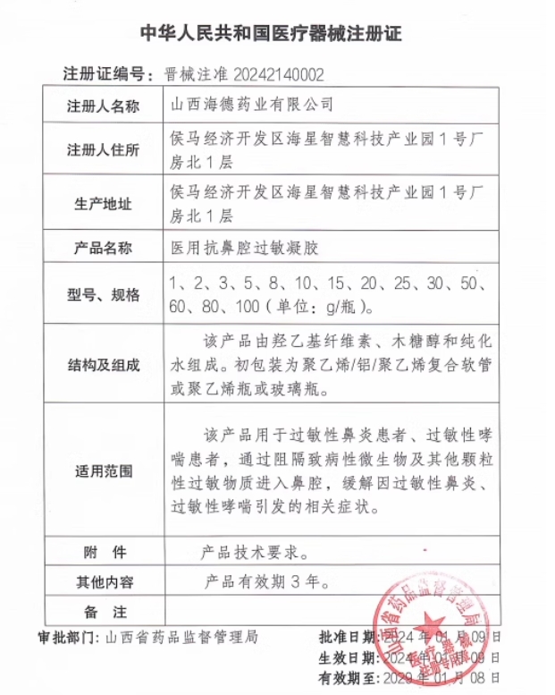 同普堂醫(yī)用抗鼻腔過敏凝膠由羥乙基纖維素、木糖醇和純化水組成。初包裝為聚乙烯/鋁/聚乙烯復合軟管或聚乙烯瓶或玻璃瓶。用于過敏性鼻炎患者、過敏性哮喘患者,通過阻隔致病性微生物及其他顆粒性過敏物質進入鼻腔,緩解因過敏性鼻炎、過敏性哮喘引發(fā)的相關癥狀。