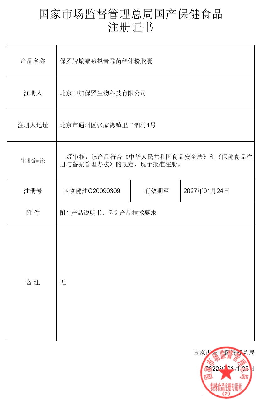 中科生物保羅牌蝙蝠蛾擬青霉菌絲體粉膠囊保健功能:本品經(jīng)動物實驗評價,具有緩解體力疲勞的保健功能;適宜人群:易疲勞者;不適宜人群:少年兒童、孕婦、乳母。