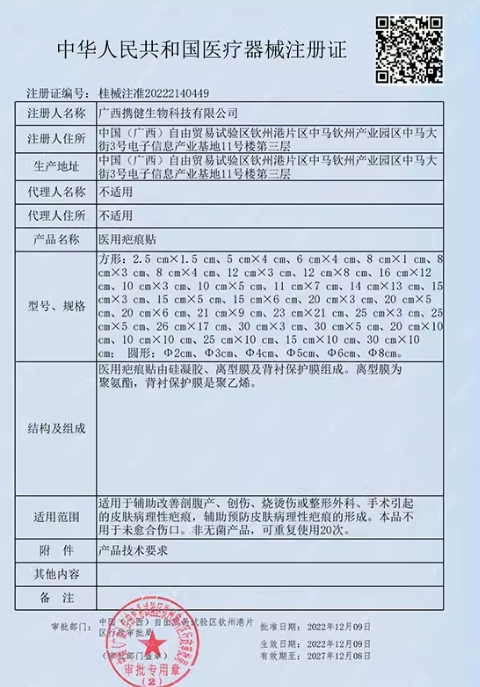 因斯博士醫(yī)用疤痕貼由硅凝膠、離型膜及背襯保護膜組成。離型膜為聚氨酯,背襯保護膜是聚乙烯。適用于輔助改善剖腹產(chǎn)、創(chuàng)傷、燒燙傷或整形外科、手術引起的皮膚病理性疤痕,輔助預防皮膚病理性疤痕的形成。本品不用于未愈合傷口。非無菌產(chǎn)品,可重復使用20次。