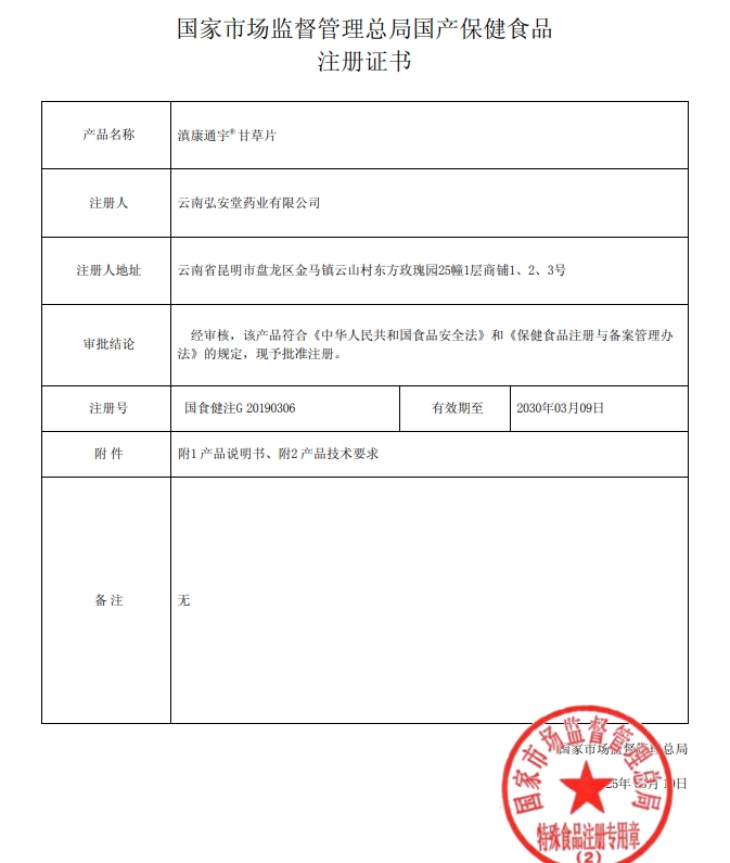 能量藤滇康通宇甘草含片保健功能:本品經(jīng)動物實驗評價,具有增強免疫力的保健功能;適宜人群:免疫力低下者;不適宜人群:少年兒童、孕婦、乳母。每日3次,每次3片,口服。本品不能代替藥物;適宜人群外的人群不推薦食用本產(chǎn)品。