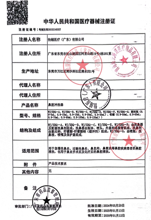 赤兔鼻腔沖洗器由洗鼻器及配套洗鼻劑組成。洗鼻器由瓶體、噴頭、外蓋和連接管組成;洗鼻劑由氯化鈉、檸檬酸-檸檬酸鈉(緩沖劑)組成。用于急慢性鼻炎、過敏性鼻炎、鼻息肉、鼻竇炎等鼻腔疾病患者的鼻腔清洗,也用于鼻炎手術(shù)后及化療后的鼻腔清洗。