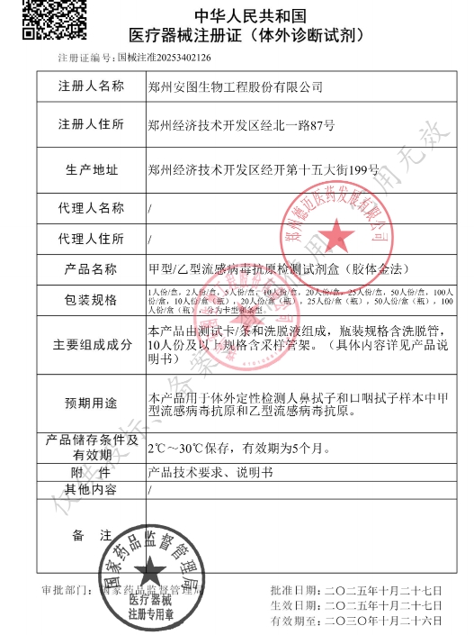 安圖生物甲型/乙型流感病毒抗原檢測試劑盒(膠體金法)由測試卡/條和洗脫液組成。用于體外定性檢測人鼻拭子和口咽拭子樣本中甲型流感病毒抗原和乙型流感病毒抗原。本試劑為一次性使用體外診斷試劑,請(qǐng)勿重復(fù)使用;測試卡在打開包裝后1小時(shí)內(nèi)盡快使用。