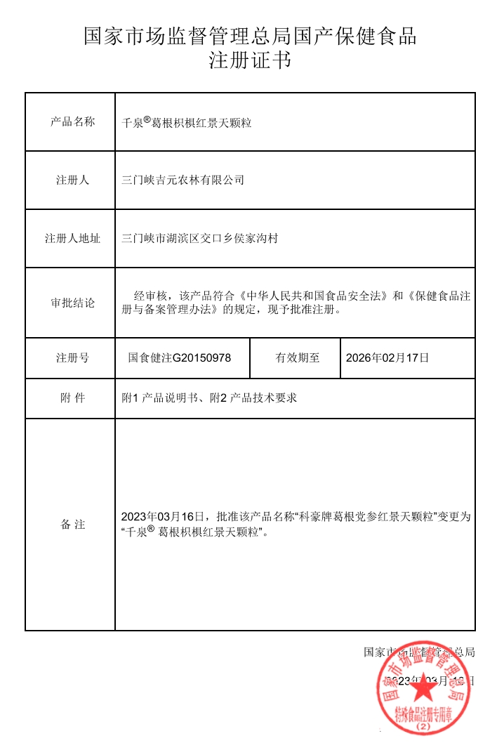 苗百護(hù)千泉葛根枳椇紅景天顆粒保健功能:對(duì)化學(xué)性肝損傷有輔助保護(hù)功能、對(duì)胃黏膜有輔助保護(hù)功能(經(jīng)動(dòng)物實(shí)驗(yàn)評(píng)價(jià),具有對(duì)化學(xué)性肝損傷有輔助保護(hù)功能的保健功能);適宜人群:有化學(xué)性肝損傷危險(xiǎn)者、輕度胃粘膜損傷者;不適宜人群:少年兒童、孕婦、乳母。每日1次,每次1袋,沖服。