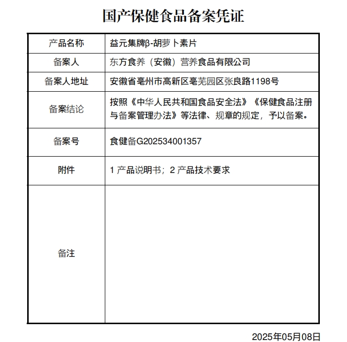 益元集牌β-胡蘿卜素片保健功能:補充β-胡蘿卜素;適宜人群:需要補充β-胡蘿卜素的成人;不適宜人群:17歲以下人群及孕婦、乳母。每日1次,每次1片,食用方法:口服。本品不能代替藥物。適宜人群外的人群不推薦食用本產(chǎn)品。不宜超過推薦量或與同類營養(yǎng)素同時食用。