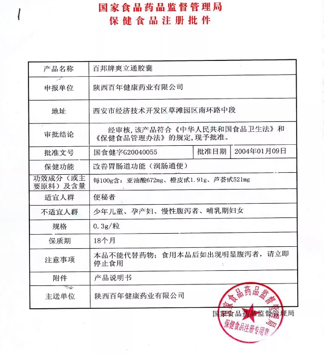 今正百邦牌爽立通膠囊保健功能:改善胃腸道功能(潤腸通便);適宜人群:便秘者;不適宜人群:少年兒童、孕產婦、慢性腹瀉者、哺乳期婦女。每日2次,每次3粒。本品不能代替藥物;食用后如出現(xiàn)明顯腹瀉者,請立即停止食用。
